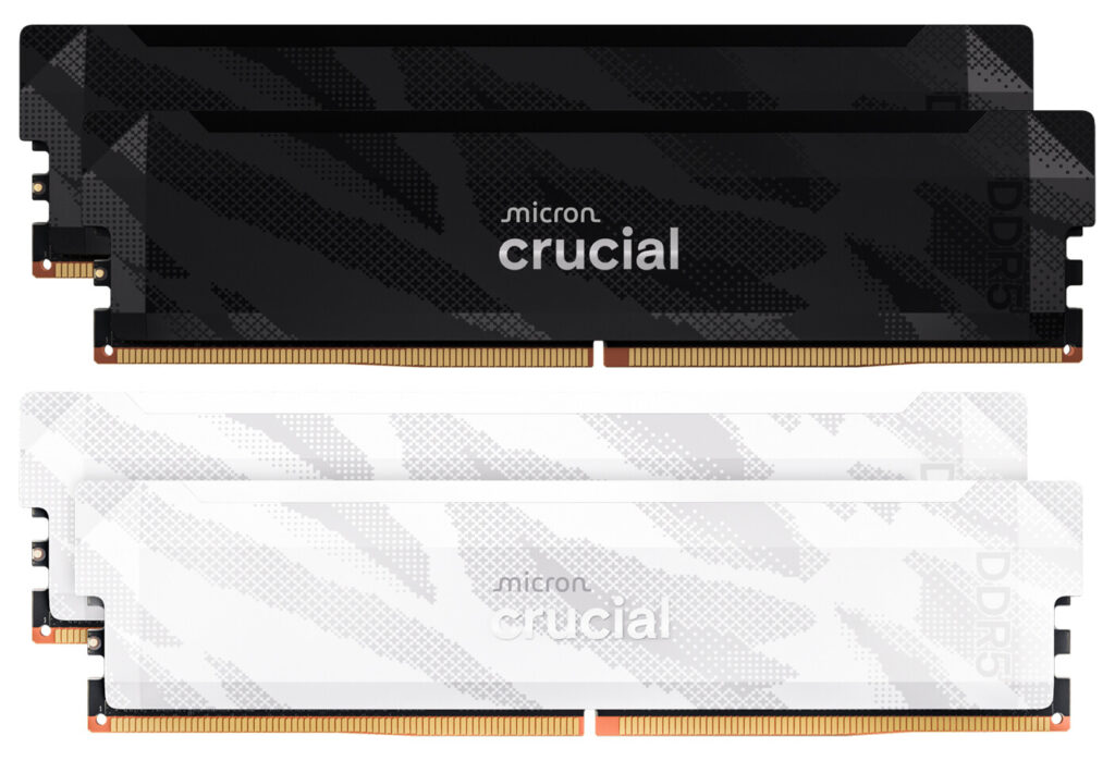 - Estetika Baru: Heat spreader hadir dengan pola terinspirasi kamuflase, tersedia dalam warna stealth matte black (hitam) atau snow fox white (putih). Logo Crucial dengan potongan berlian (diamond-cut) dan branding “Crucial Pro” yang tebal memberikan tampilan taktis yang halus dan modern.